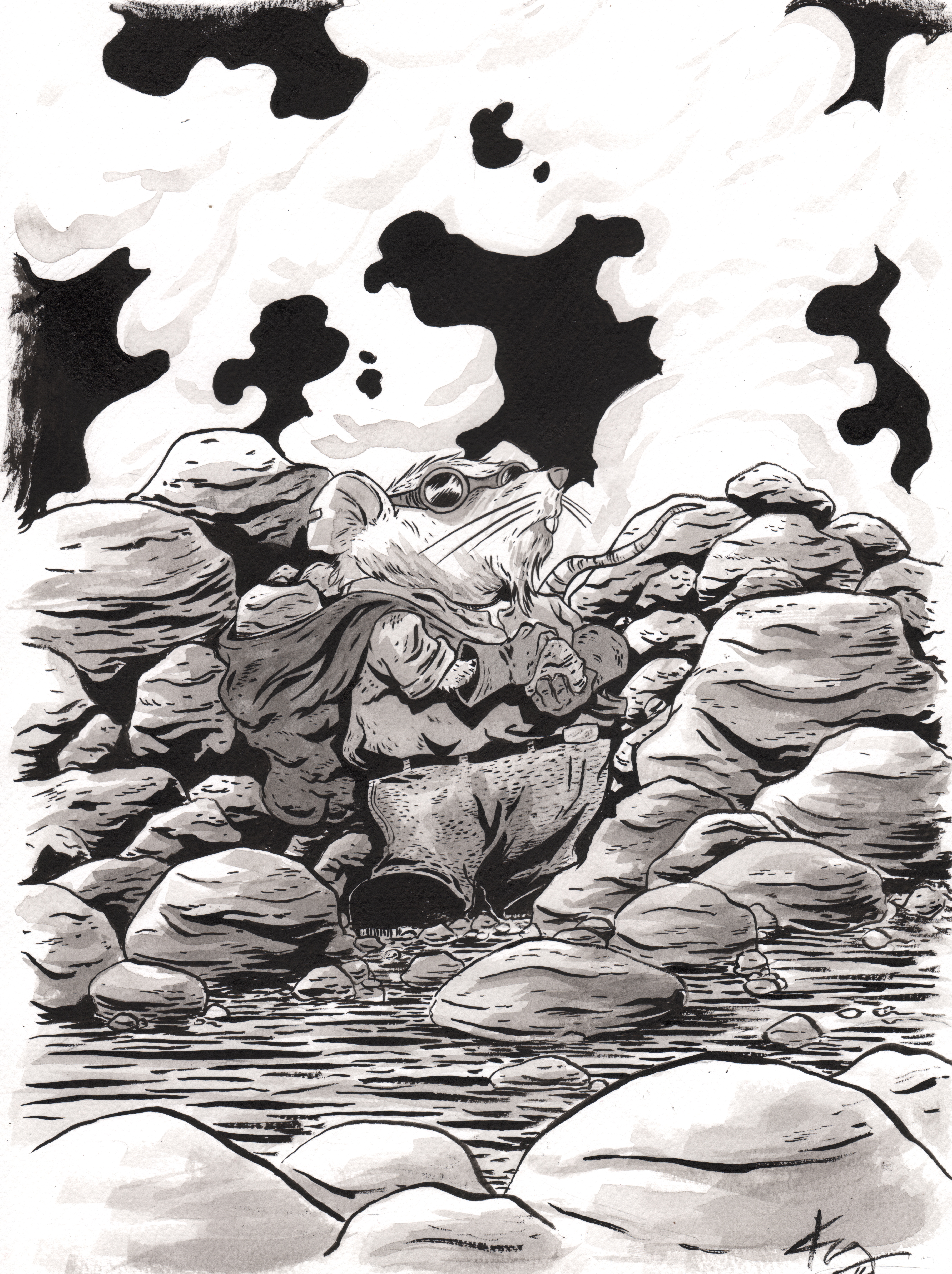 I went with engineer rats. North American in origin I believe. Lumberjacks believed that these engineer rats would come down after rockslides and collect rocks and put them back in their proper places. I mean, come on, a chance to draw a rat with goggles on?? I’m in!