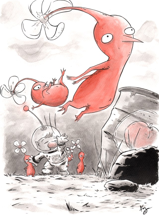 This weeks entry was rushed since I’ve been very busy. It is also a tip of the hat to one of my favorite newer video game properties. If by chance you are unfamiliar with the Pikmin games from the brilliant mind of Nintendo’s Shigeru Miyamoto, basically you are Olimar, an astronaut who crash lands on an alien planet. You only have a months time (if I recall correctly) to repair your ship and get off the planet before your life support runs out. There are plenty of creatures and other obstacles that stand in your way. The Pikmin are tiny plant creatures that Olimar discovers and gets to help him.