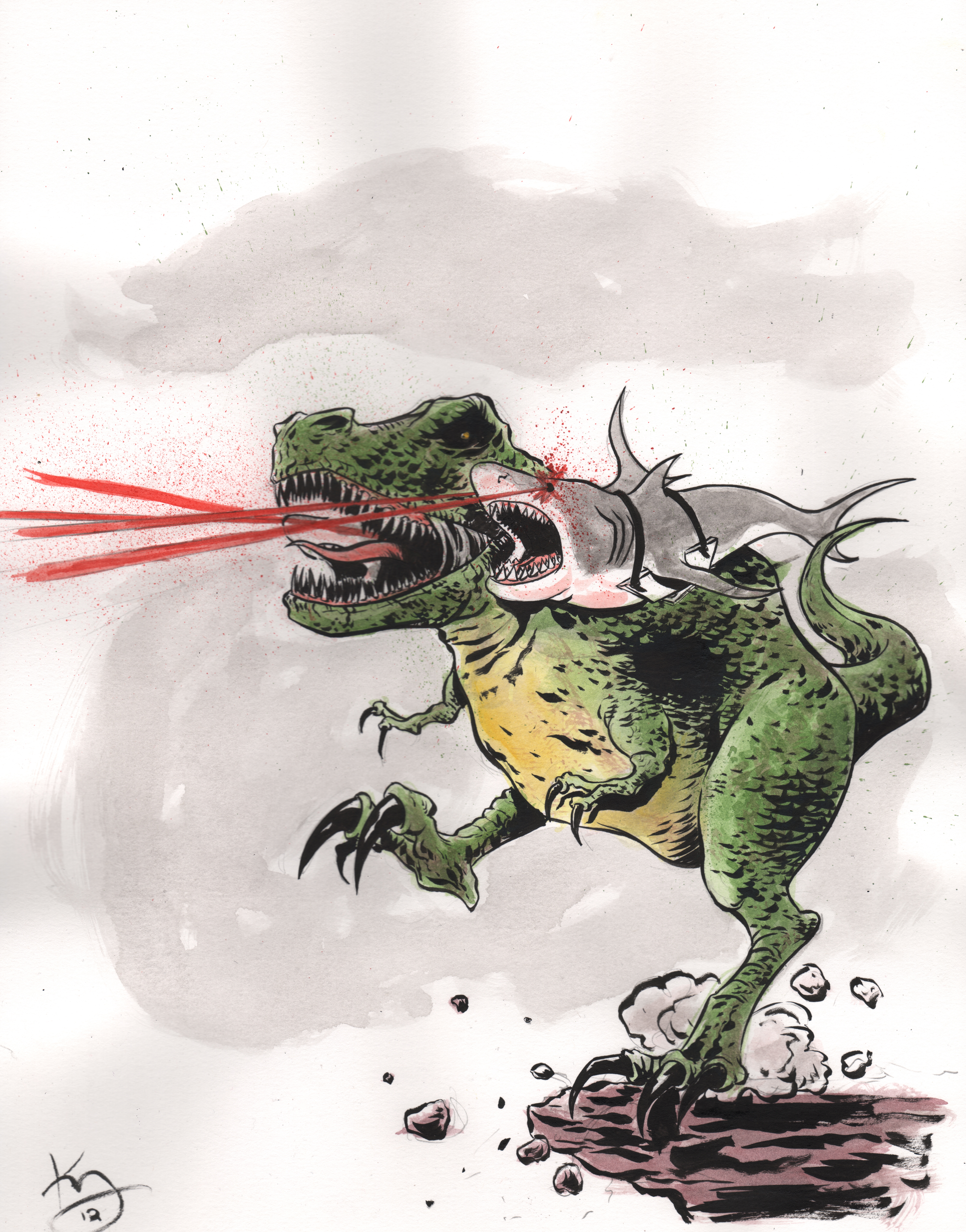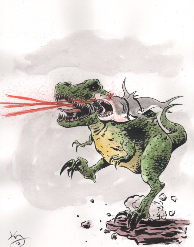 2 Responses to Tyrannosaurus Rex with shoulder mounted Great White sharks (that shoot lasers)