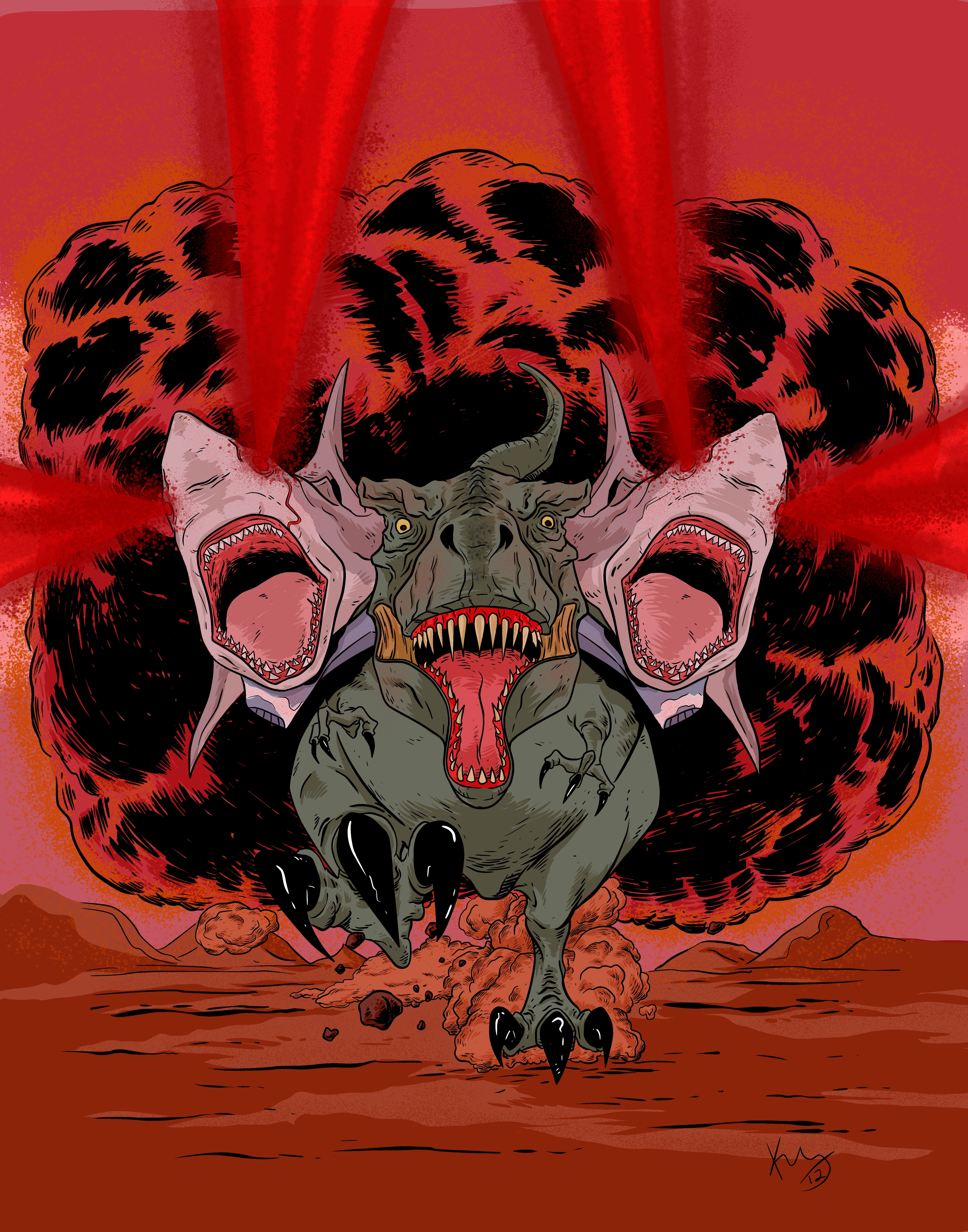 2 Responses to New Print Available! T-Rex with Shoulder Mounted Great White Sharks (that shoot lasers)