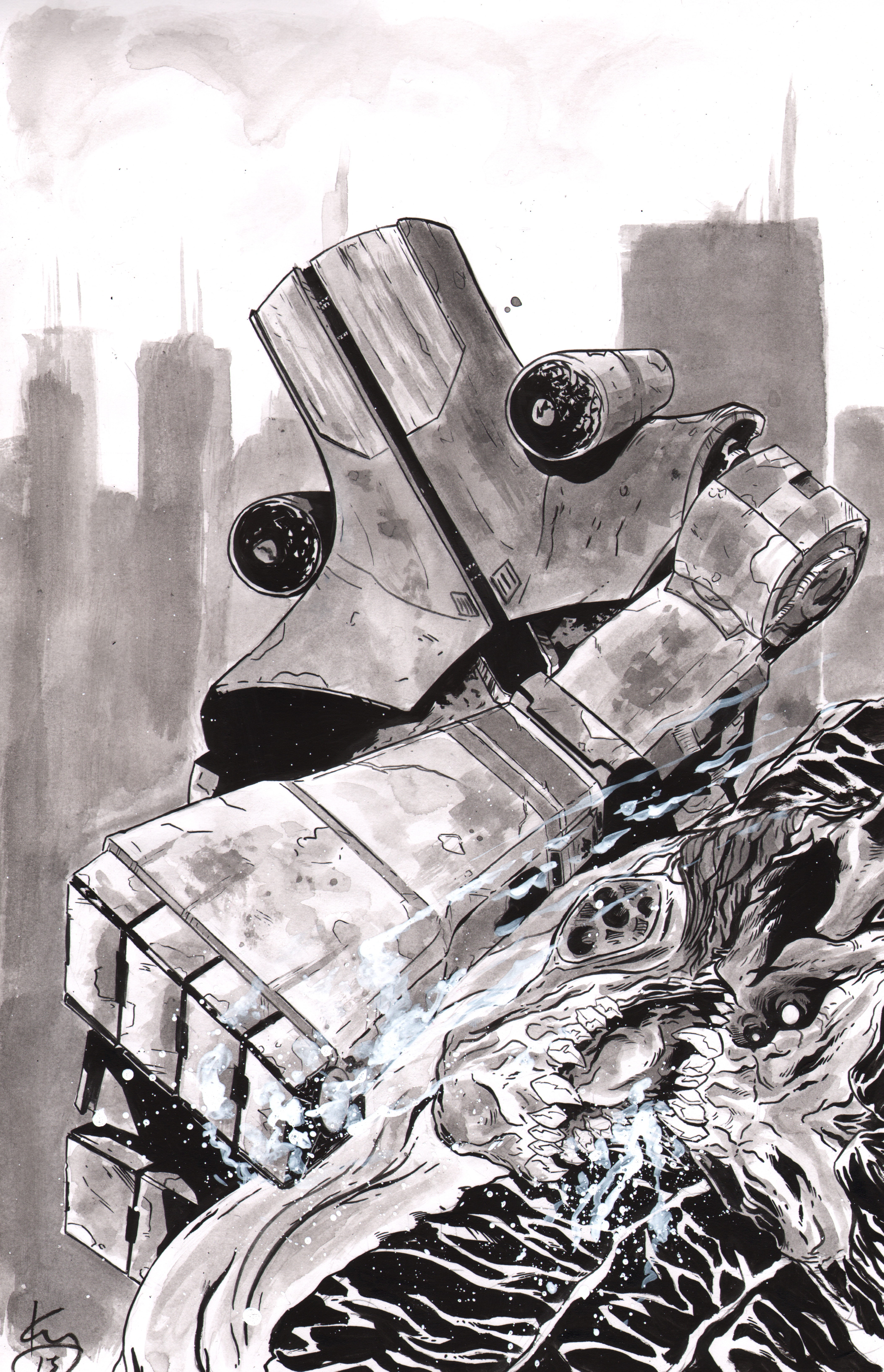 The second in the completed $50 11×17 commissions is Cherno Alpha punching a Leatherback Kaiju. Though, I kinda want to add a lot more blood….
