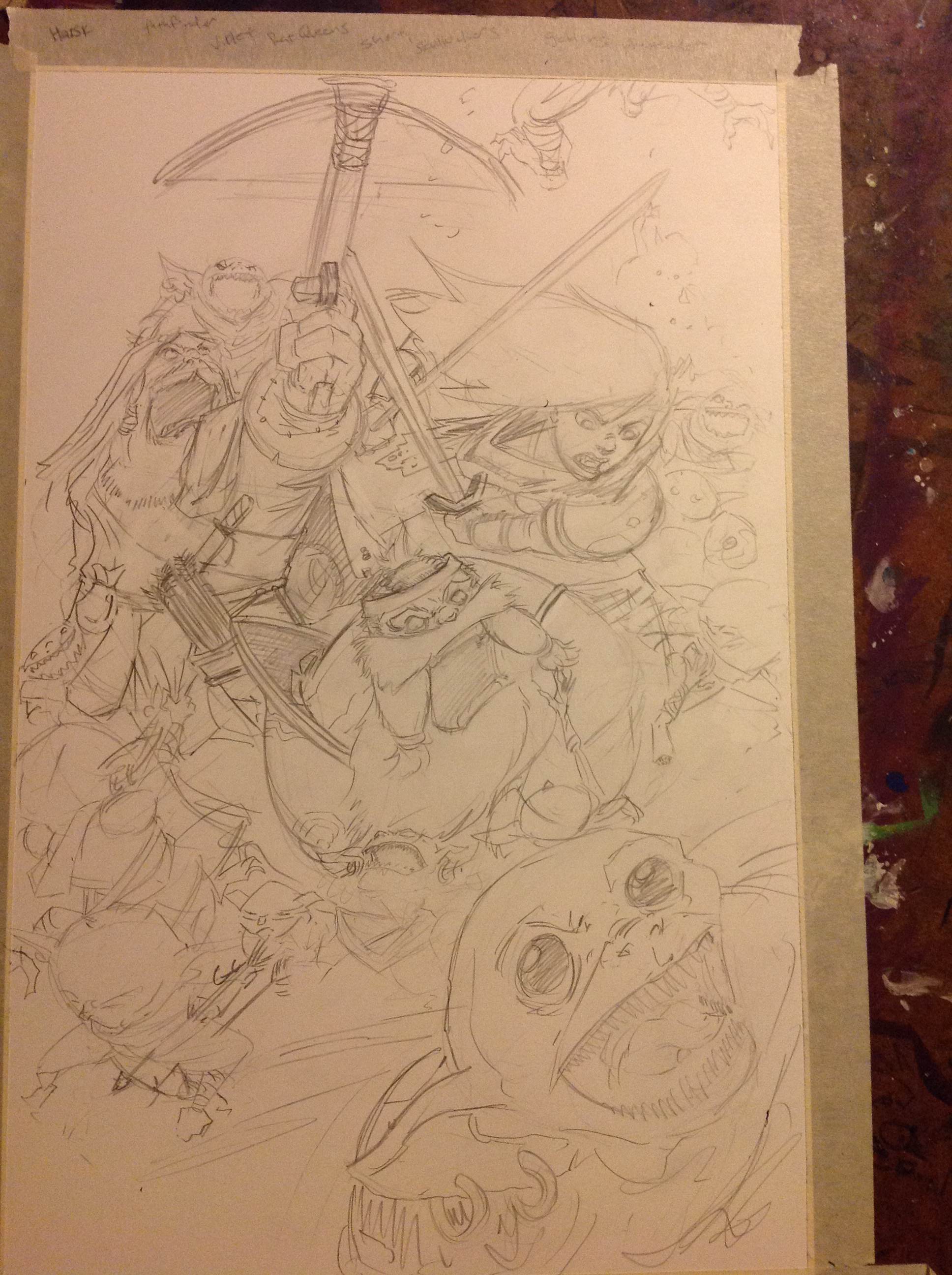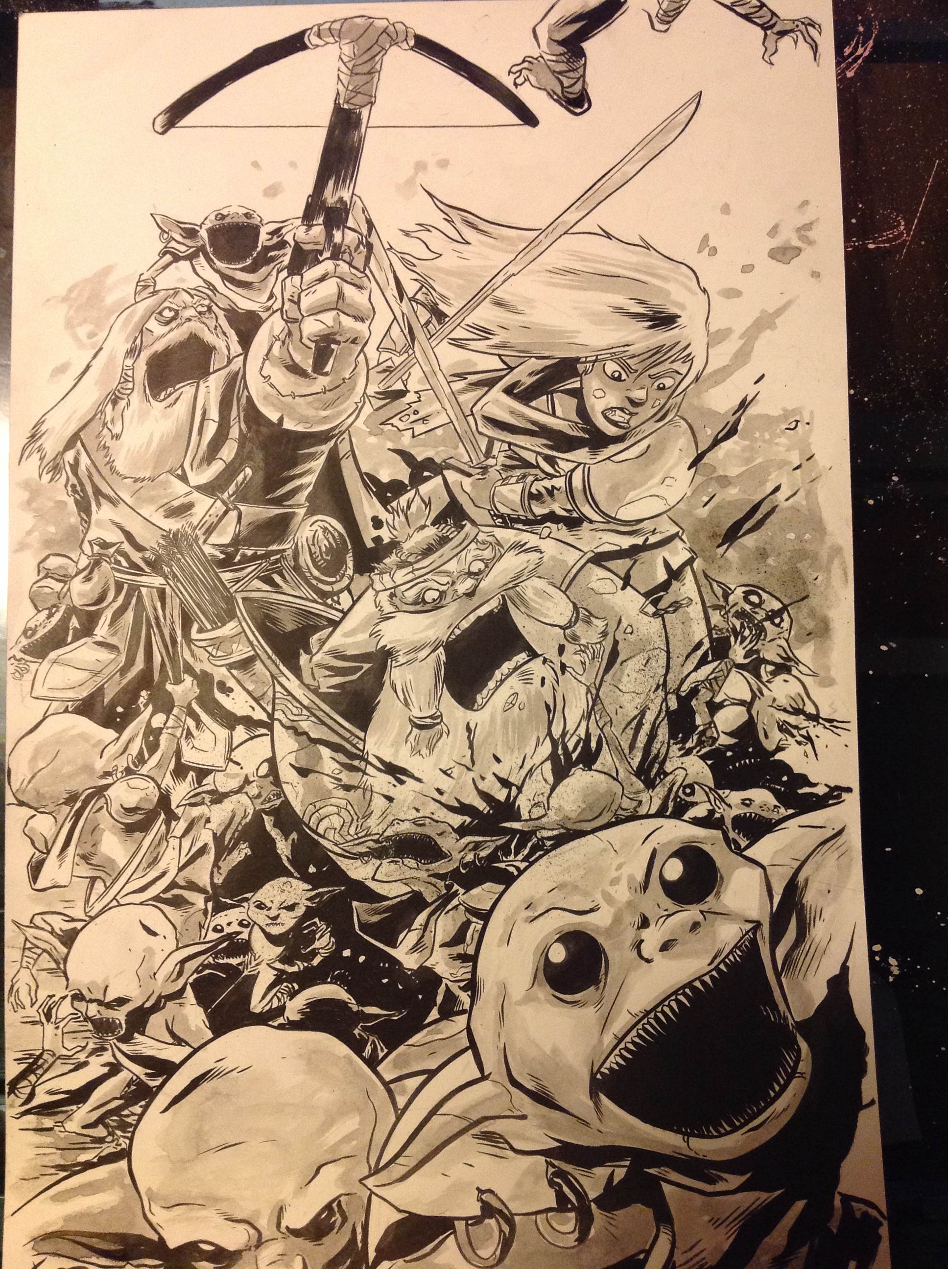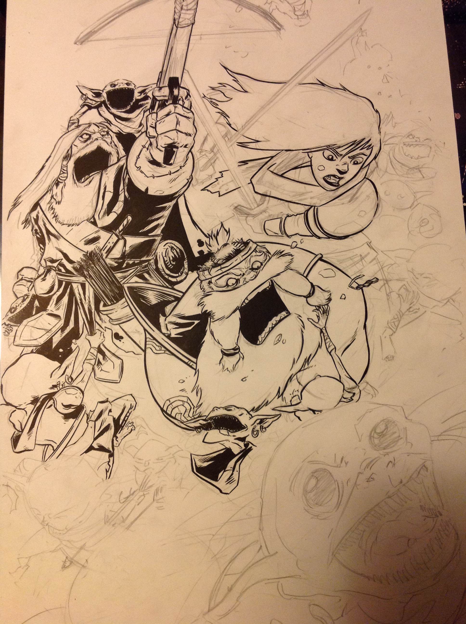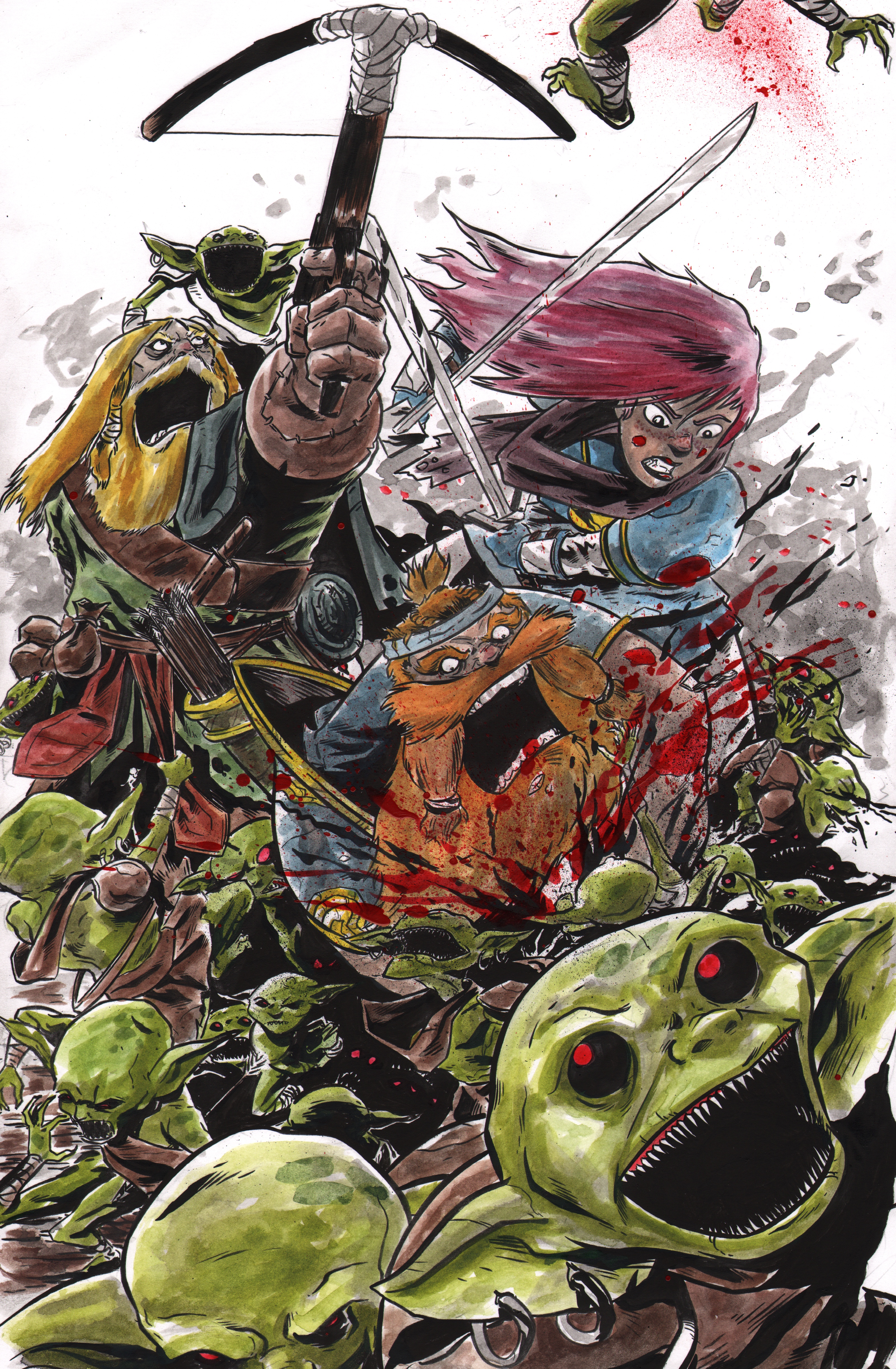 I was asked to do a mashup of dwarves from various comics/games. Harsk from Pathfinder, Violet from Rat Queens and Shorty from Skullkickers, fighting goblins. Sooo…