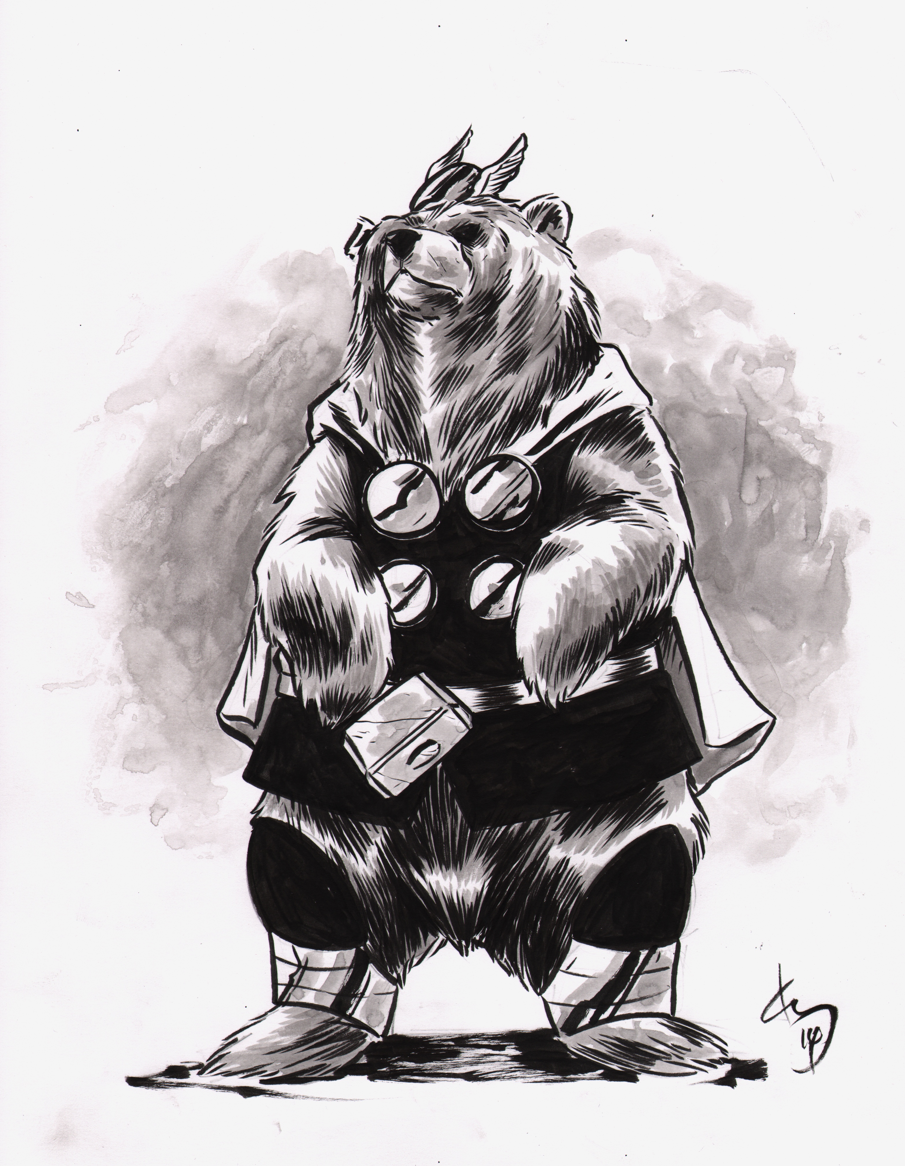 Late last night after a full day laying out EGO TRIPP pages I decided to do a drawing just for fun. After very little thought I decided to draw a bear dressed like Thor. Because bears are awesome and fun to draw. Dressing them up in drawings is even more fun.